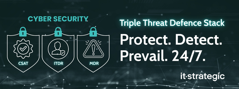 Protect your business from evolving threats led by AI and deepfake infiltration and social engineering. IT Strategic’s Triple Threat Defence Stack combines 24/7 Managed Endpoint Detection & Response, Managed Identity Threat Detection & Response and Cyber Security Awareness Training for your whole team! It’s our strongest baseline cyber security stack yet! Find out more.